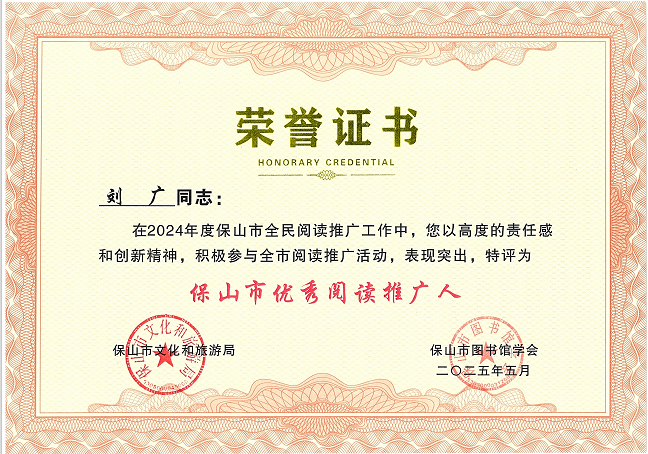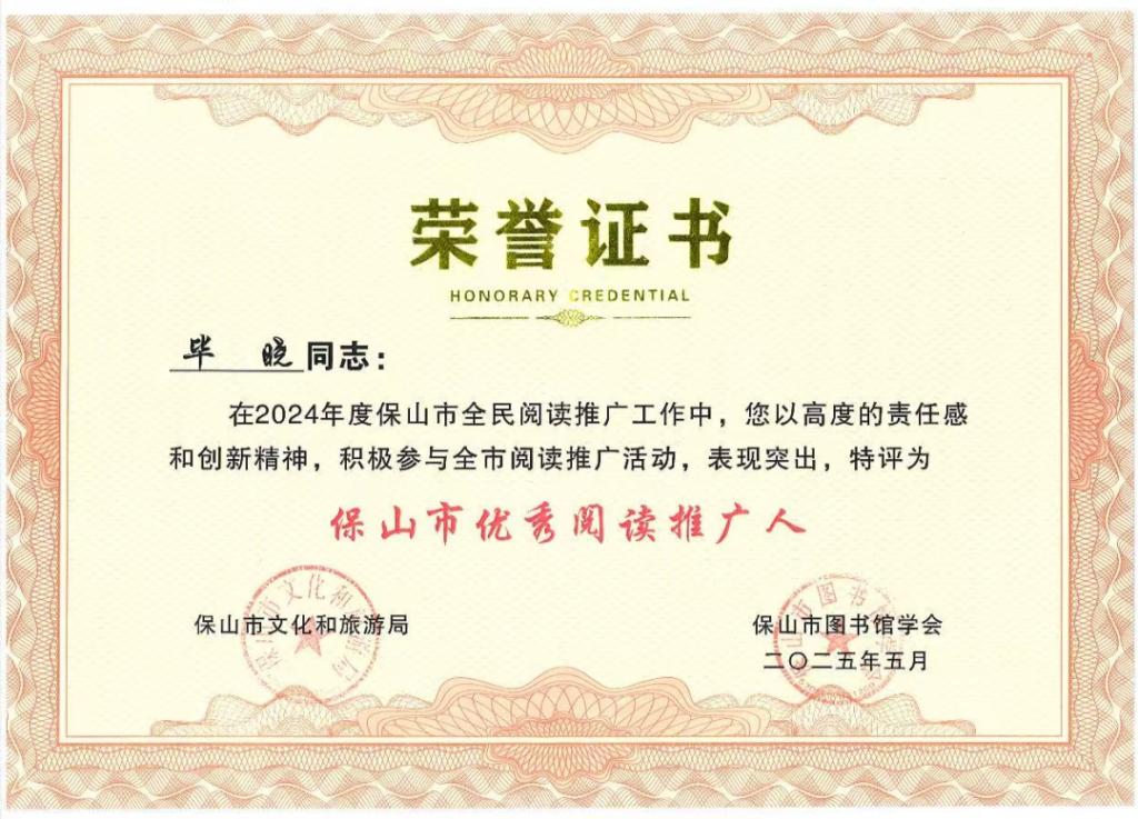 我校图书馆在资源共建、阅读推广和技术支持等方面有卓越表现,荣获“2023—2024年度优秀会员单位”。教师毕晓、刘广、强文娟在阅读推广工作中有突出贡献,获评2024年度“保山市优秀阅读推广人”。