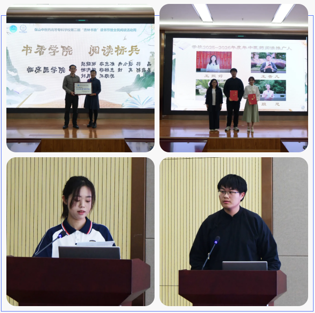 图书馆负责人推介2026年全年读者活动安排。仪式为2025年度获“书香学院”称号的临床医学院颁发奖牌,第十一届全国悦读中医活动“全国中医药阅读推广人”李思颖和王晋凡分别做荐读和阅读交流分享,充分发挥“全国中医药阅读推广人”的榜样作用,承担起阅读推广与文化传播的使命,身体力行推广全民阅读活动。